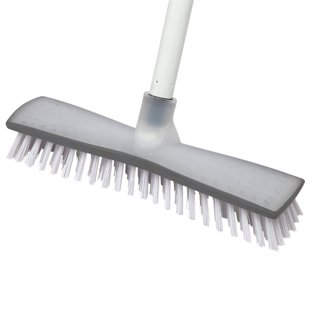 A compact deck scrub designed for effective cleaning of floors, patios, and hard surfaces. Its sturdy bristles and ergonomic handle allow precise scrubbing in commercial and household settings. Ideal for removing dirt, grime, and residues efficiently in hospitality, industrial, and facility maintenance environments.